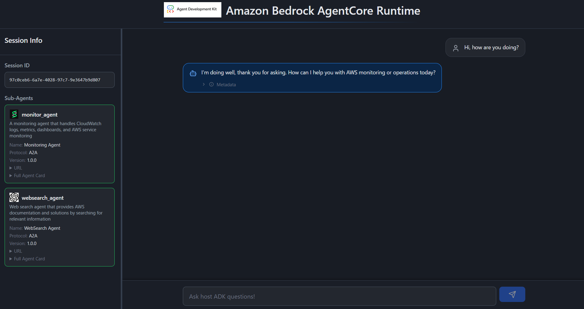 このサンプルでは3つのAgentがA2Aで協調します。全体をつかさどるホストエージェント、AWSのログを検査するモニタリングエージェント、ウェブの検索を行うウエブエージェント、です。