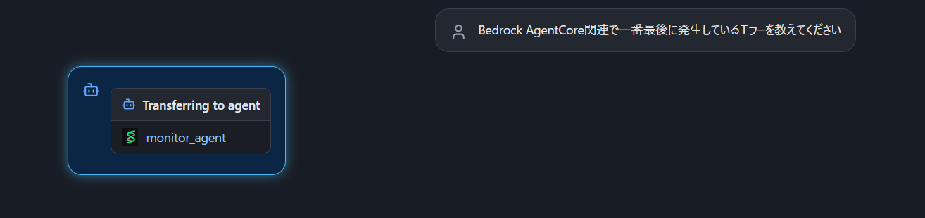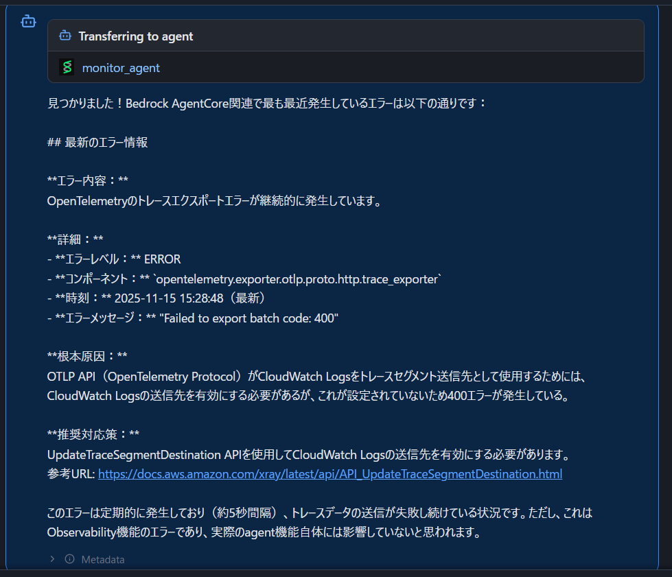 CloudWatchのログに関する質問を行うとこのようにAgent間で呼び出しが行われていることがわかります。