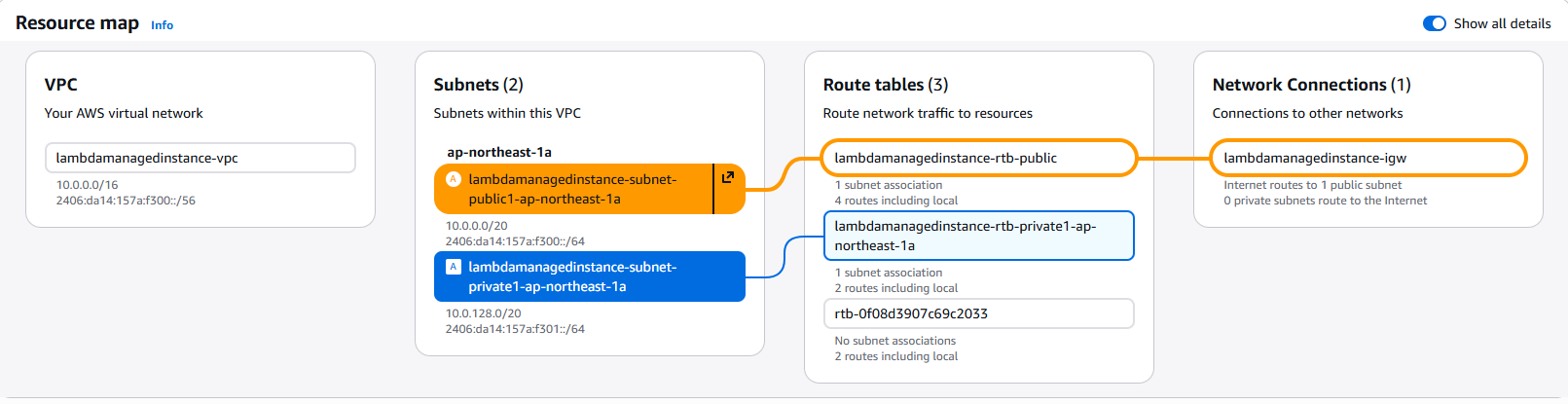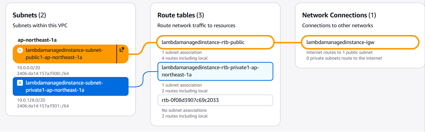 Lambda Managed Instance で作成されたLambda関数は、VPC上のEC2で動作します。このためネットワーク条件などはすべてVPC、つまりEC2を起動するサブネットの影響を受けます。