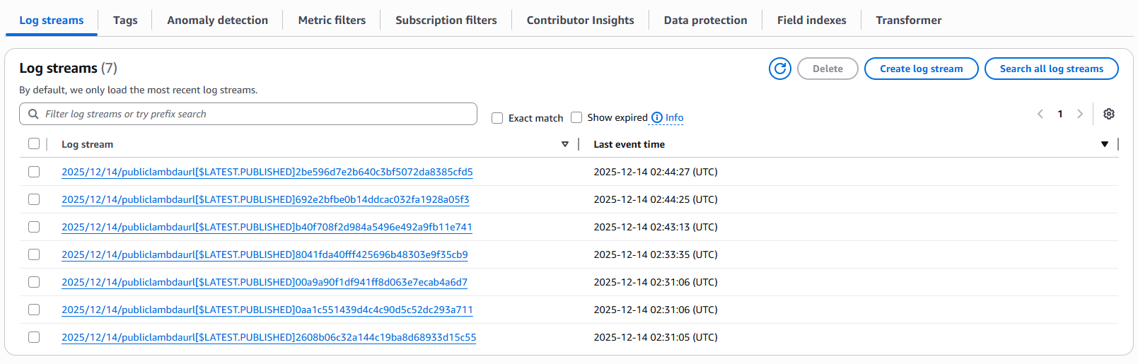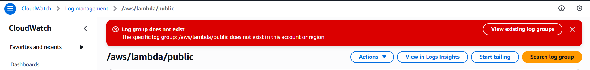 通常Lambda関数が実行されたときには CloudWatch Logs に関数専用のロググループが作成され、起動ログを確認できるようになっていますが、以下の通りエラーとなります。