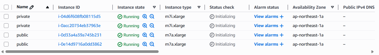 以下の様に4つEC2インスタンスが起動します。Capacity Providerは例えAZが1つであったとしても必ず2つのEC2インスタンスを起動するようです。