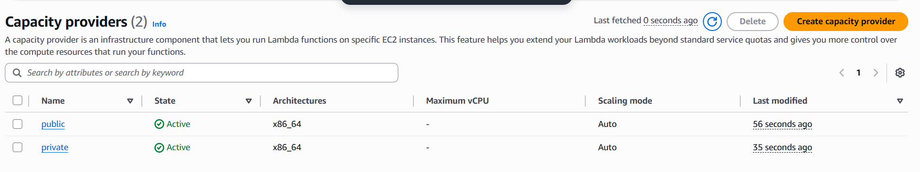 前回書いたAWS Lambdaの新しい選択肢AWS Lambda Managed Instanceとは?実際にEC2を起動して動かしてみたの記事の内容に従いCapacity Private を2つ、それぞれPublicとPrivateサブネットに作成します。