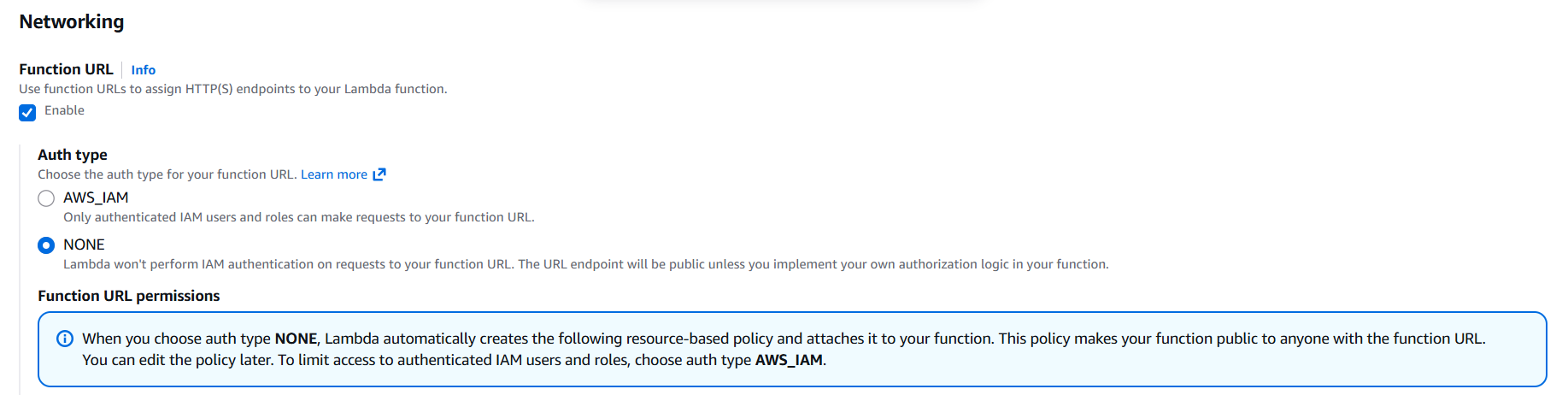 こちらも同様に前回の記事に従い関数を作成します。ただし今回は Lambda URL オプションをオンにします。こうすることでLambda関数を外からブラウザ経由で呼び出すことができます。