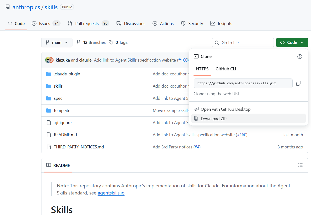 anthropics/skills GitHub レポジトリで多くの実務的なサンプルが提供されているためこちらを試していきます。
