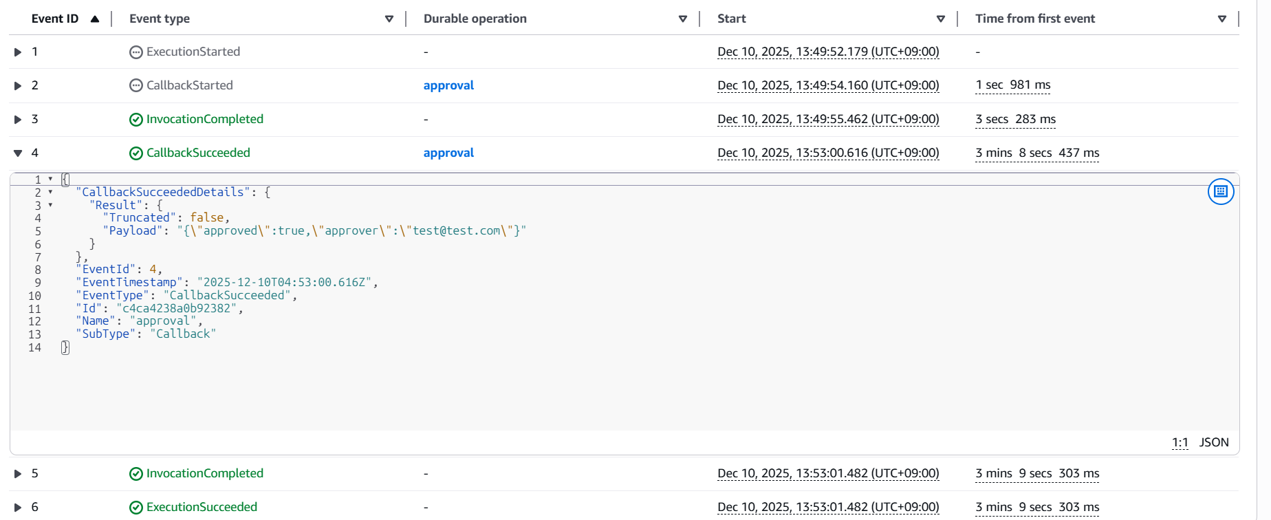 });適当なテストイベントを作成しテストを行うとRequest Catcher にCall Back IDを出力したのち待ちとなります。待ち状態の間はCPU課金はされません。