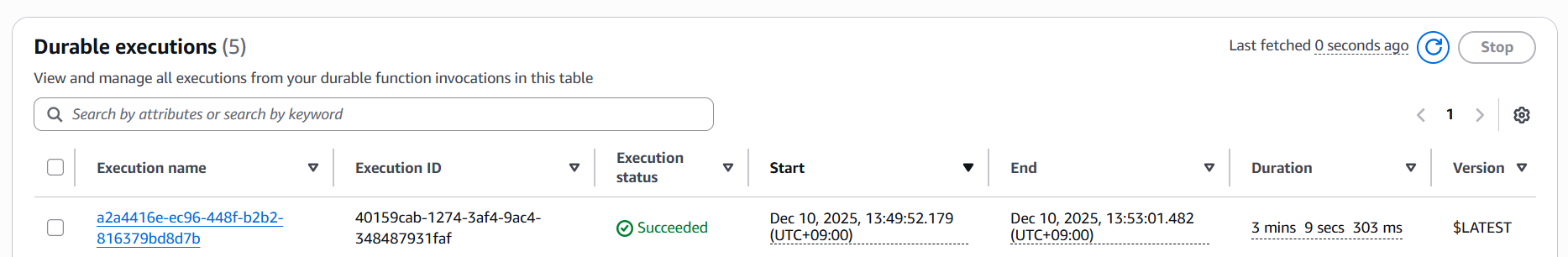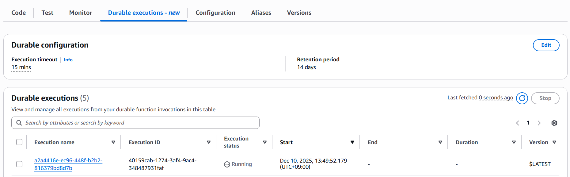 Lambdaコンソール Durable executionsタブでは以下の様に実行中となっています。